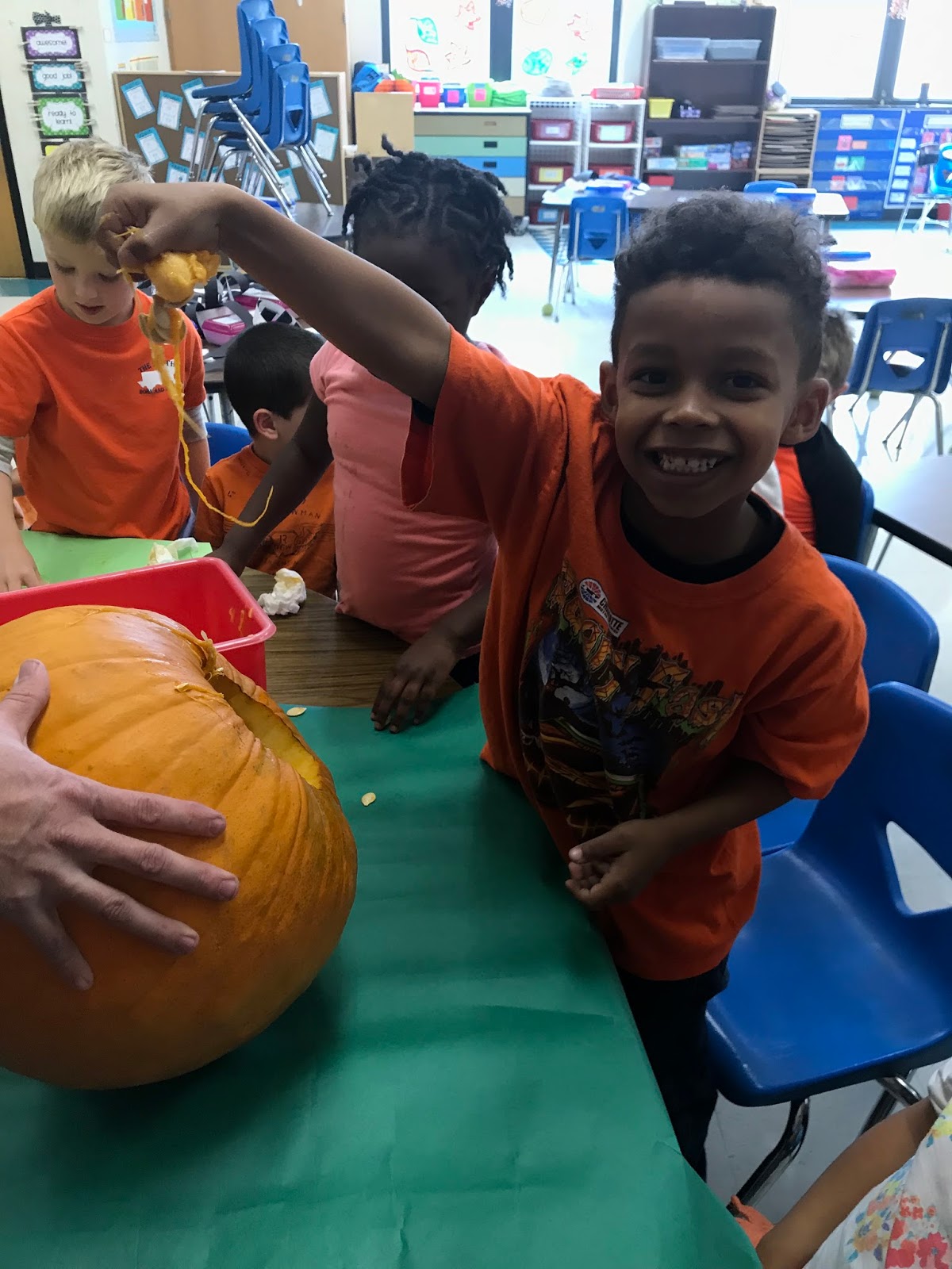 Another thing we did to go along with our pumpkin theme was... carve a pumpkin!!! Yes!! Scarlett's daddy, Mr. Moore, came into our classroom and carved our pumpkin for us. We had the best time helping him scoop out the inside of the pumpkin. It felt gooey and gross but it was fun! Thank you to Mr. Moore for helping our class out. We appreciate you!